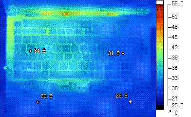 ThinkPad X301的C面温度控制十分出色,掌托两侧测试温度在30度上下。键盘部分,左侧略为偏高,测试温度为34.8度,在同类产品中表现还是可圈可点的。