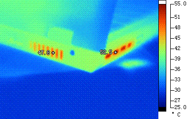 产品背部前端温度控制不错,测试温度都在33度以内。背部后端左侧温度较高,测试温度为41.2度。处理器出风口温度测试温度较高,不过出风口设计在产品靠近后部的位置,不会影响到用户的使用感受。